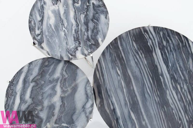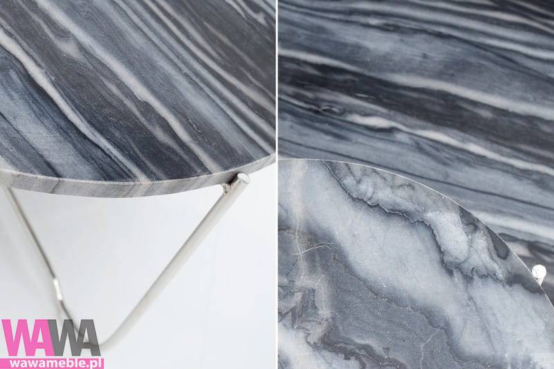 | Opis dodatkowy | Stolik inspirowanym stylem Vintage. Blat z szarego marmuru ręcznie polerowanego. Unikatowy wzór z naturalnego kamienia. Dostarczony model może różnić się usłojeniem ,ponieważ mamy blat z kamienia naturalnego. Każdy stolik ma inny unikatowy wzór.Stelaż z metalu w kolorze stali polerowanej. Średnica blatu 60 cm, Grubość blatu: 15mm, Nogi śr.1,5 cm Waga ok.: 40 kg Produkt do samodzielnego montażu. Wysokość: 33 cm Szerokość: 62 cm Głębokość: 62 cm |